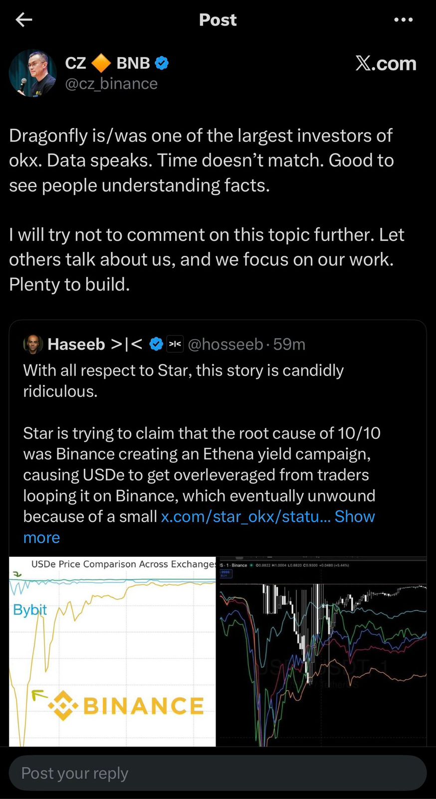 Dragonfly is/was one of the largest investors of OKX. Data speaks. Time doesn’t match. Good to see people understanding facts,” CZ wrote on X, referencing criticism from Dragonfly Capital general partner Haseeb Qureshi, who had earlier dismissed Xu’s claims as “candidly ridiculous.”