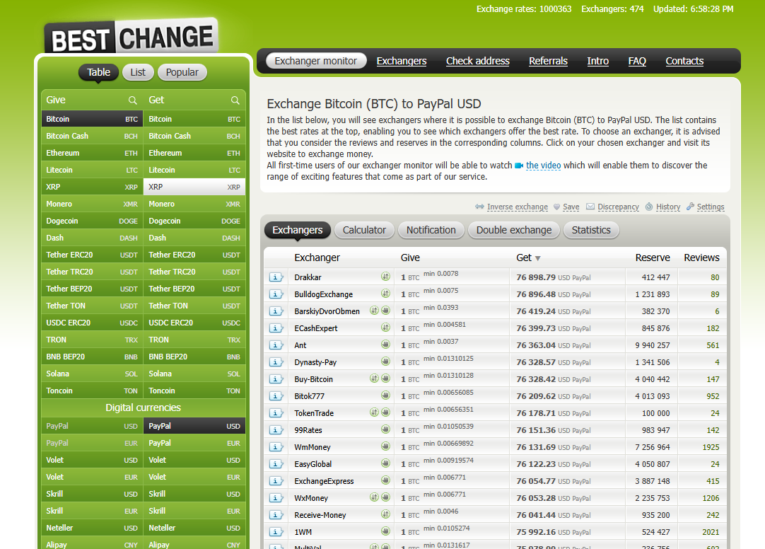 BestChange offers a simple BTC exchange system. It features a minimalistic, nostalgic UI that clearly showcases an exchanger list. It has recently launched its BTC to PayPal USD exchange offer, and exchangers have quickly been added to the database already.