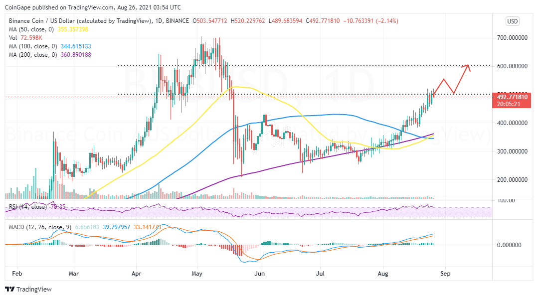 Binance Coin is brushing shoulder with $500 following a brief swing higher on Thursday during the Asian trading session. The native exchange-based token sustained an upward roll from the lows seen in July at $255. However, bulls found it a challenge cracking and settling above $500. Besides, the lethargic price action seems to have been accentuated by the widespread pullback in the market.