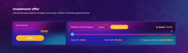 - Random investment offers a profit from 19%-15% per day to 11%-7% per day. The amount of profit received is determined randomly. The total profit varies from 133%-105% to 231%-147%.