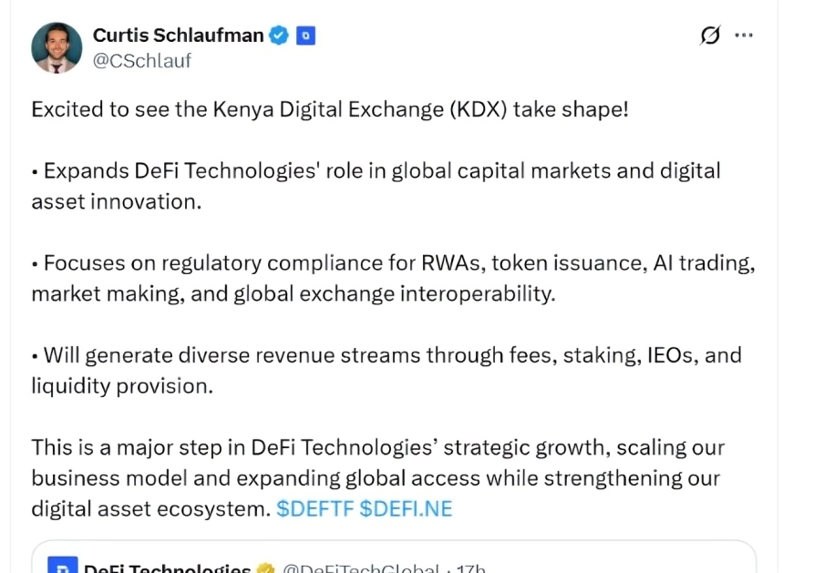 Curtis Schlaufman, the Vice-president of VP Marketing and Communications at DefiTech, revealed in a X post that the new Kenya Digital Exchange (KDX) aims at expanding his company’s role in global capital markets and digital asset innovation.