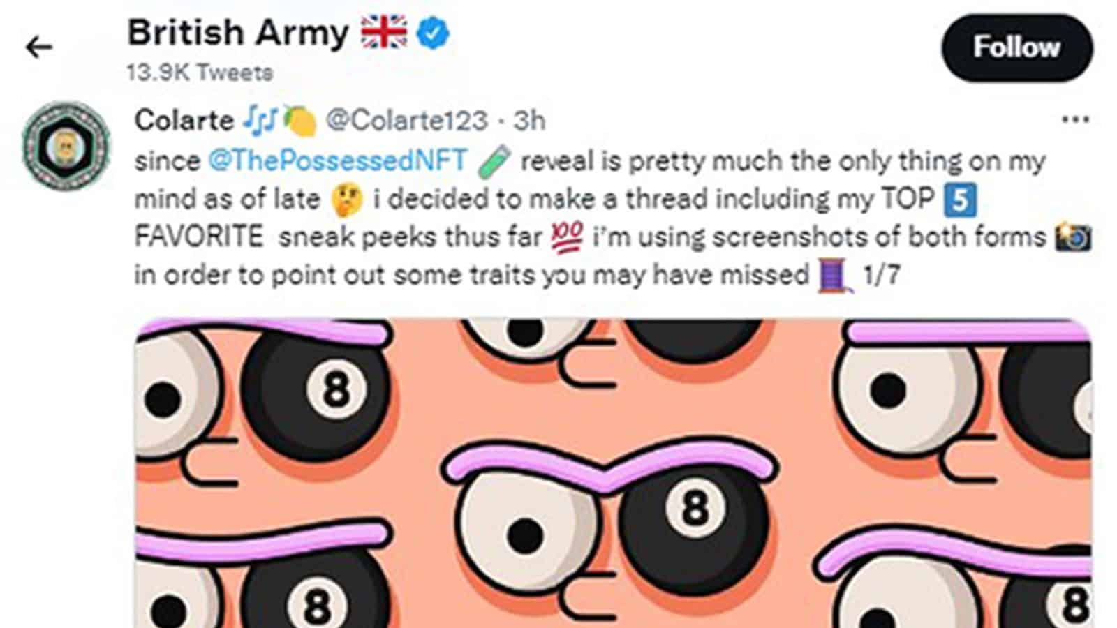 The hackers renamed the Twitter account of the British Army to Bapesclan. Then they made several posts relating to non-fungible tokens (NFTs). Besides, they also changed the profile picture to an ape-like cartoon with clownish make-up.