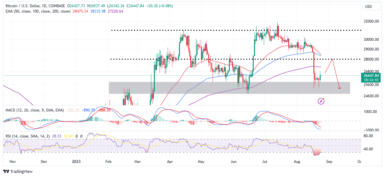 BTC price, up 1.7% on Thursday to $26,438, is attempting to recoup the losses from last week’s deleveraging event. The most prominent crypto plunged to $25,000 after an extended low volatility period marked by support at $29,000 and resistance at $30,000.