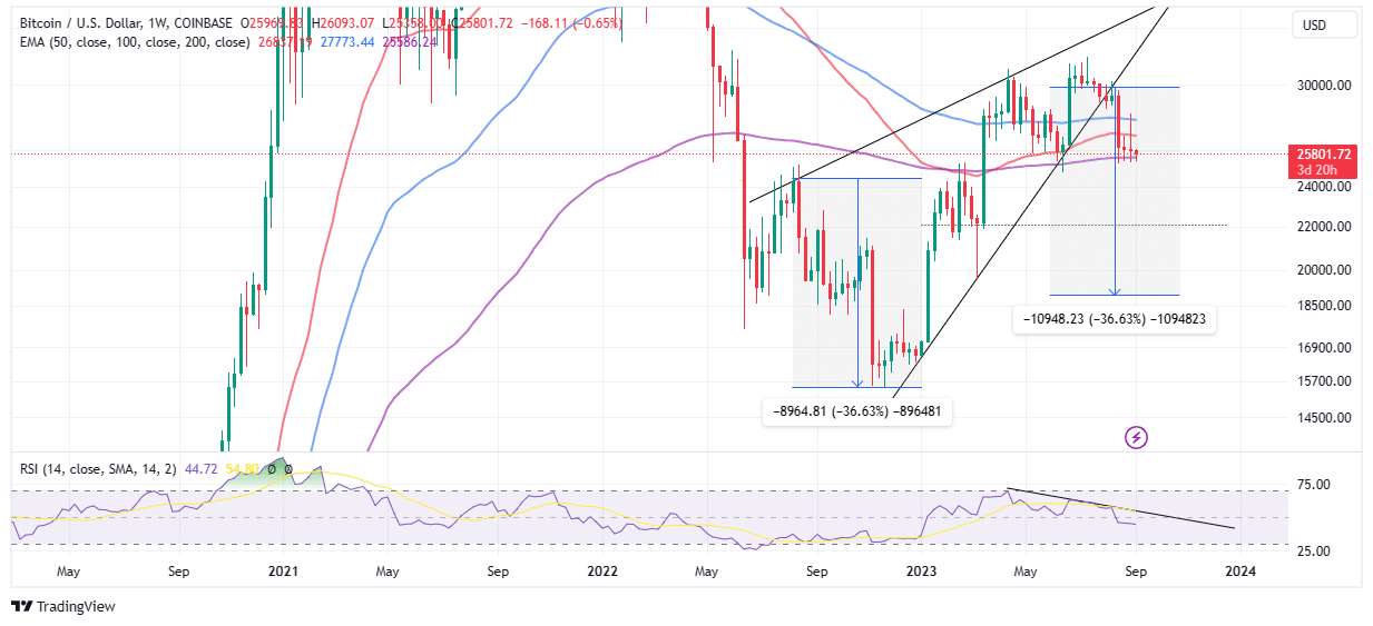 Losing support at $30,000 marked a bearish turning point which was greatly underestimated by analysts and investors. In addition to putting an end to the bullish technical outlook that had propelled the price of Bitcoin to $32,000 in June, the breakdown confirmed a critical rising wedge pattern.