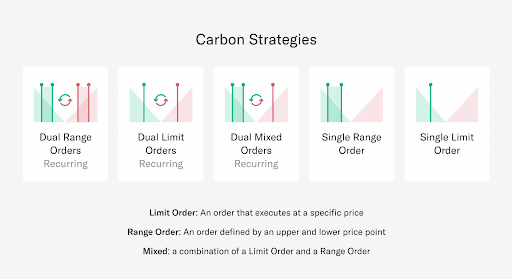 One of the biggest issues on current AMM models is the risk of impermanent loss (IL), whereby a liquidity provider (LP) is only profitable when the relative price between the tokens provided in a pool remains constant. In Carbon, there is no Impermanent Loss, in the sense that orders are not buy-and-hold liquidity positions, but the expression of a particular trading view. Carbon orders can take the form of native on-chain limit orders, dollar cost averaging (“DCA”), and “buy low, sell high” range orders.