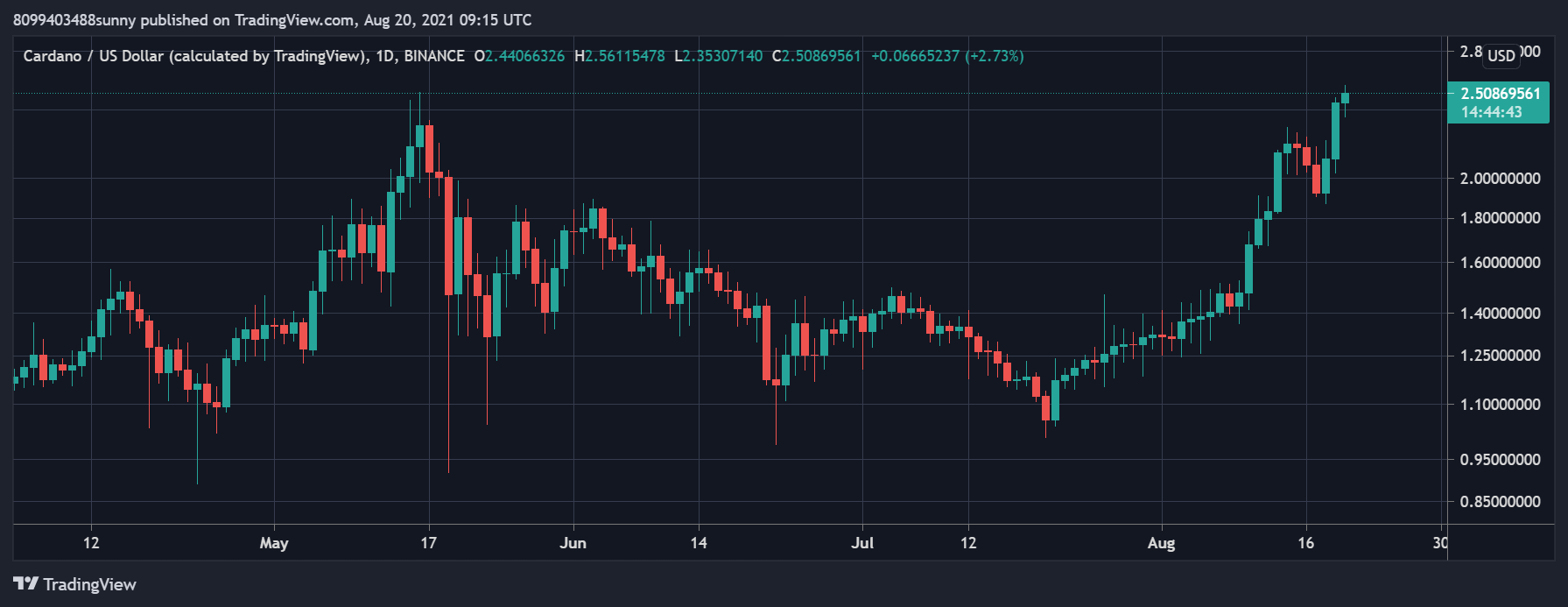 Cardano (ADA) reclaimed the third spot earlier today on the back of a 22% surge that saw the altcoin post a new ATH of $2.55. Cardano has now joined Terra (LUNA) and Solana (SOL) to become the third altcoin to reach a new ATH after the market crash in May. ADA rose from a daily low of $2.05 to post the new ATH.