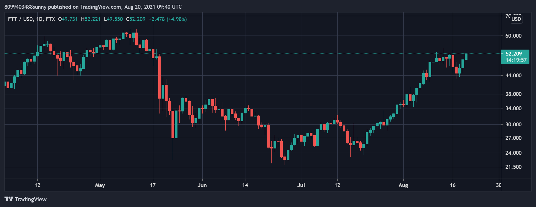 The crypto market has recovered valiantly in August post three months of bearish trends dominating the market. Most of the cryptocurrencies have recovered nearly half of their losses from the May market sell-off and now looking set to retest their ATHs. Both Bitcoin (BTC) and Ethereum (ETH) are down by nearly 27% from their ATH. However, the next crypto token that could possibly post a new ATH is FTX crypto exchange’s native token FTT.