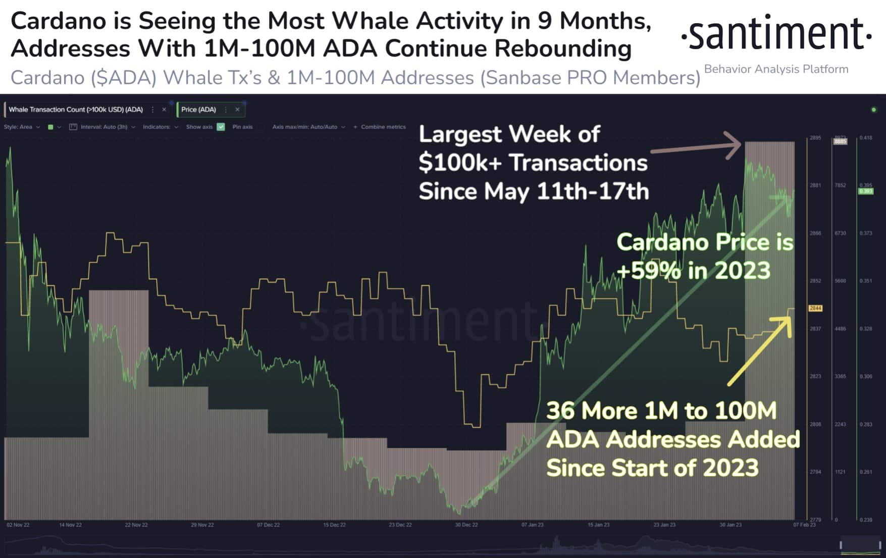 “Cardon’s price is up +65% in 2023, and key shark & whale accumulating has had a lot to do with this. Addresses holding 100K to 100M $ADA now hold the most in their combined wallets since Nov. 8th. Today, $100k+ whale transactions hit a 12-week high”.