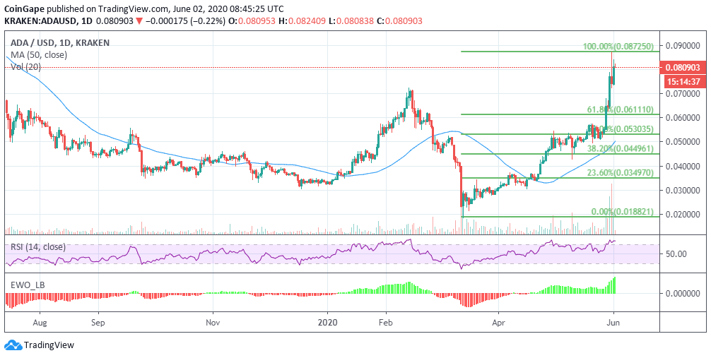 The RSI is also trending high within the overbought region to show that the influence bulls have on the price is immense. If the RSI sustains the trend above 70, ADA could ignore the overbought conditions and shoot above $0.1. Fundamentally, ADA is strong to take down the resistance at $0.1 and could only be waiting for the proper volume.
