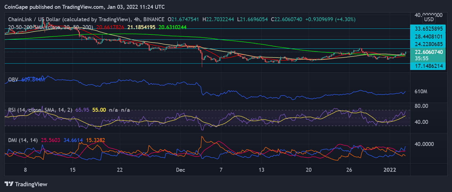 The other resistance level stood at$28.44 and $33.65. Indicators have remained positive, reflecting the change which LINK encountered 24 hours ago. The LINK price was seen above the 20-SMA, indicating bullishness on charts.