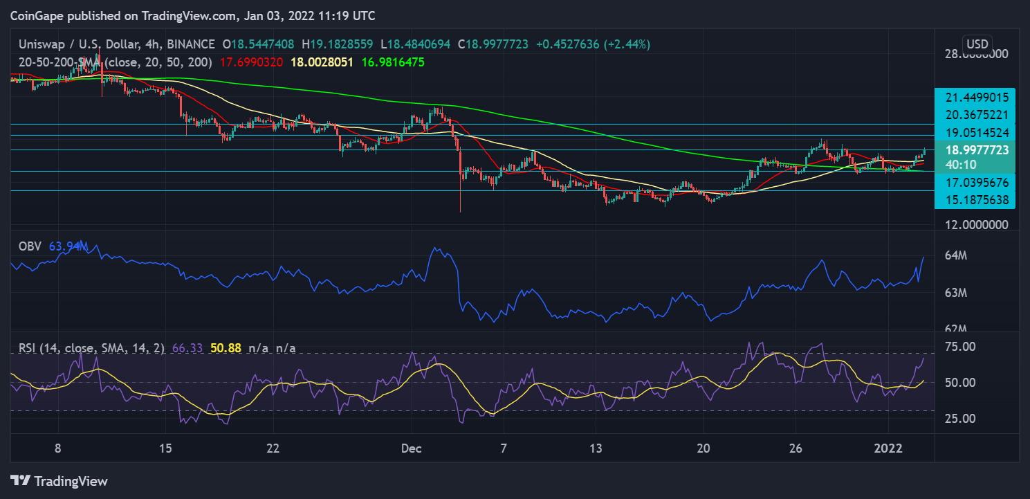 Uniswap invalidated its bearish thesis, which the coin struggled to reverse for most of December. Immediate resistance for the coin was at $19.06, moving above which the coin could attempt to trade near the $20.36 price level. Over the last 24 hours, the coin surged 9.3% and was trading for $18.99.