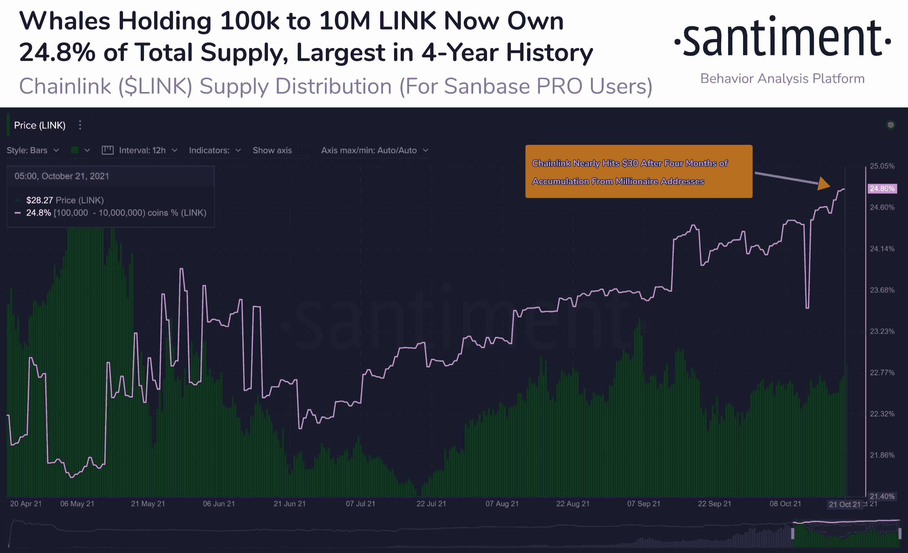 As of press time, Chainlink (LINK) is trading 6.17% up at a price of $29.86 with a market cap of $13.3 billion. The recent price rally comes amid heavy whale accumulation for the LINK. As on-chain data provider Santiment reports: