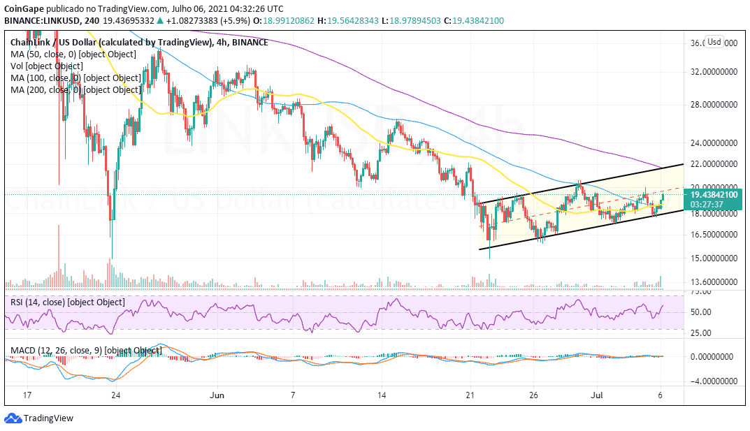 Chainlink’s four-hour chart reveals the uptrend taking the shape of an ascending parallel channel. Moreover, LINK price is about to flip the selling pressure at the channel’s middle boundary, a move that may trigger many buy orders above $20.