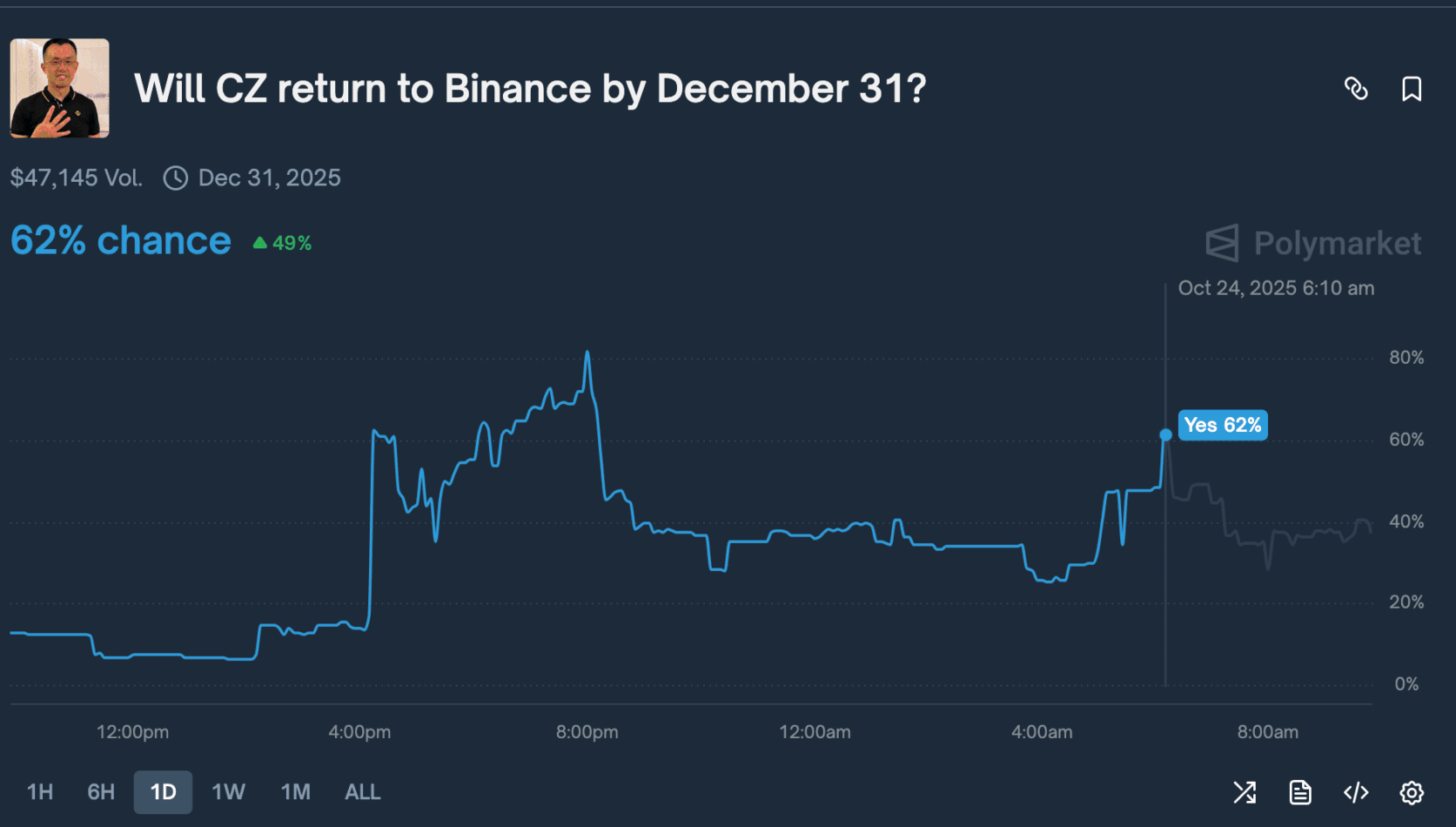 - PolyMarket shows 62% odds of CZ returning by December 31.