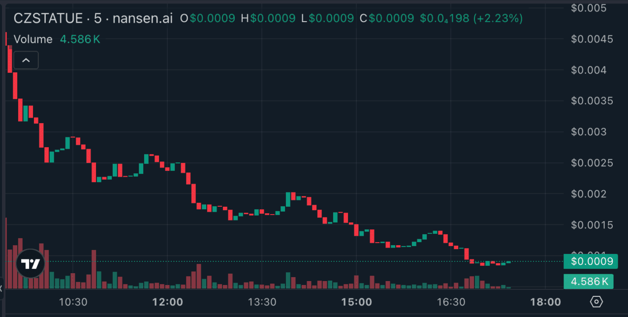 Crypto analytics firm Nansen later reported that CZSTATUE had lost 99% of its value within hours of peaking, dropping from a $5.1 million valuation to near-zero levels.