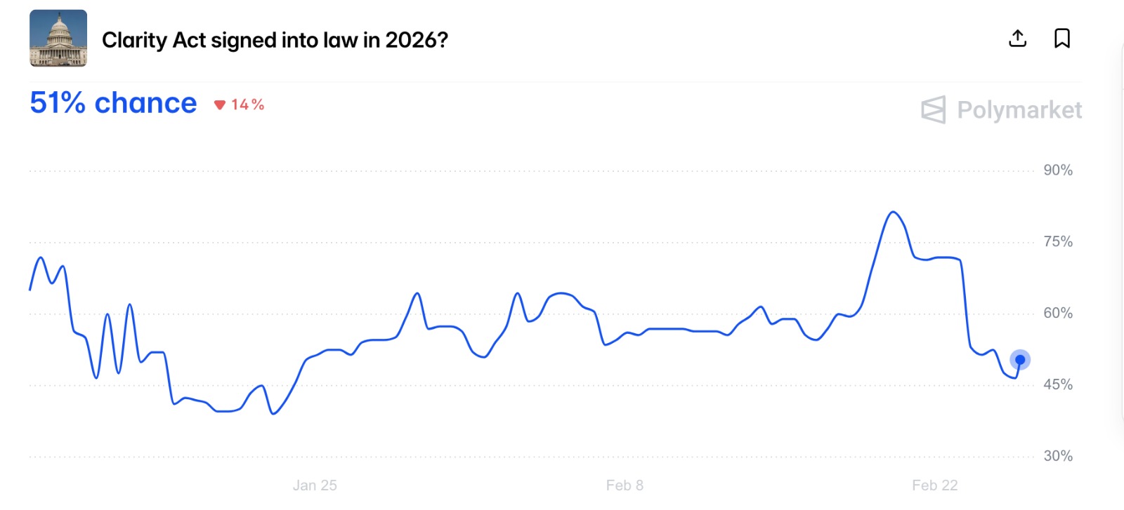 Prediction market odds show the growing uncertainty around the CLARITY Act timeline. Polymarket shows a 51% chance the bill becomes law in 2026, down 14%. Kalshi places the odds of passage before May at 35%.