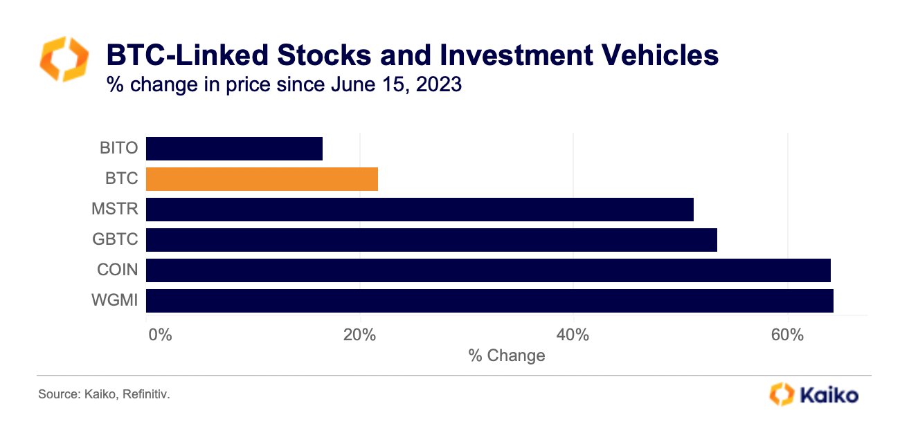 According to data provided by Kaiko, Coinbase ($COIN) is the second biggest gainer among the Bitcoin linked stocks and investment vehicles. Coinbase stock price recorded a return of more than 65% since 15 June 2023. $COIN price is trading at an average price of $106.19, up by 1.5% in the last 24 hours, at the press time.