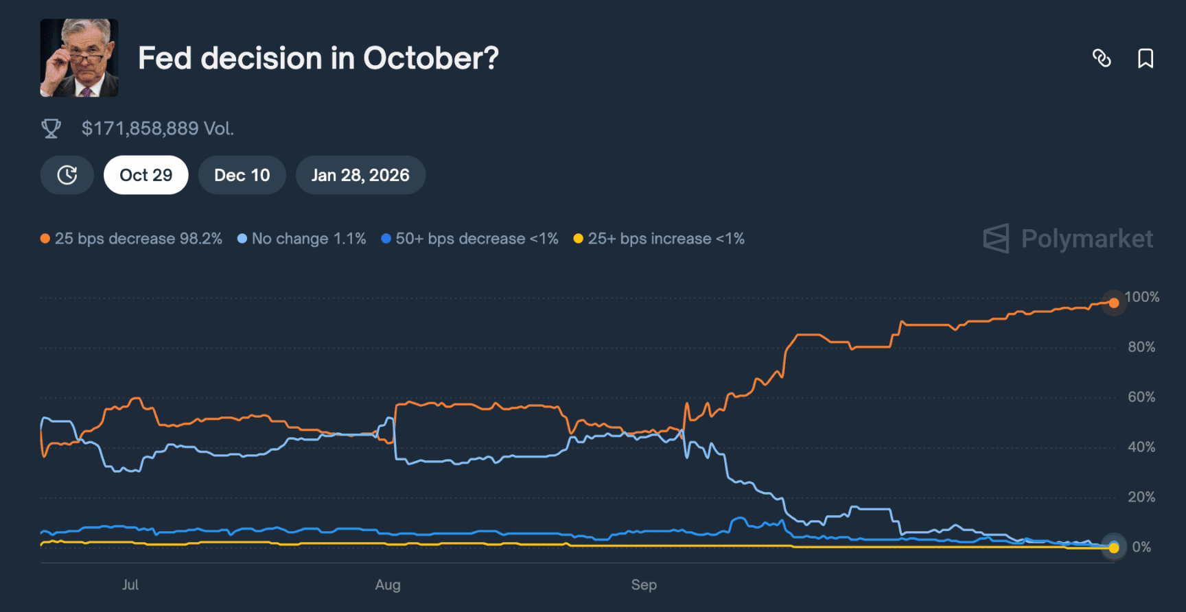 A quarter-point Fed rate cut on Wednesday would place the policy rate between 3.75% and 4.00%. Traders are already pricing in additional cuts for December and January. According to Polymarket data, 98% of traders are betting on a 25bp cut in the FOMC meeting.