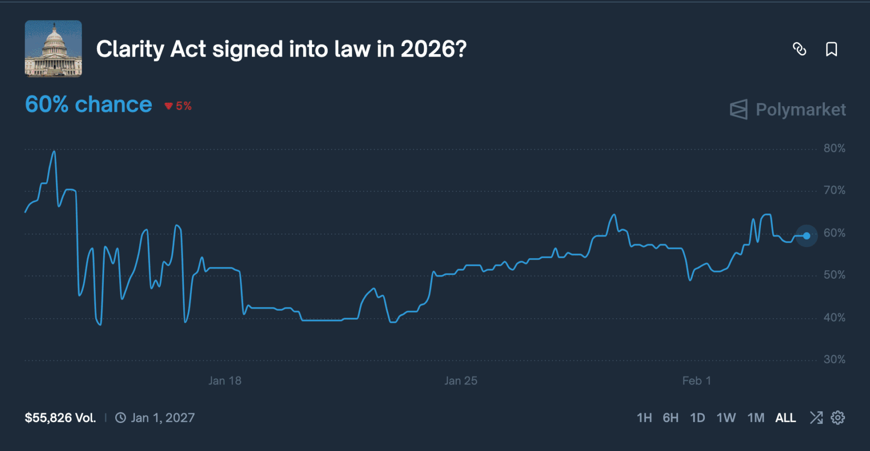Notably, Polymarket traders are now growing more confident that the legislation will be made law in 2026 despite setbacks. They assigned a 60% chance of its passage this year.