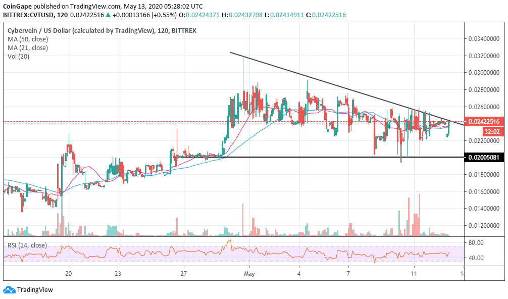 At the time of writing, Cybervein has recovered to highs of $0.0242. The price is also seating above the moving averages where the 50 Exponential Moving Average (EMA) and the 21 EMA are providing support at $0.0238 and $0.0236 respectively. On the upside, the bulls are dealing with the resistance at the falling triangle (descending trendline). A break above this zone would catapult CVT to highs seen in the last week of April ($0.032).