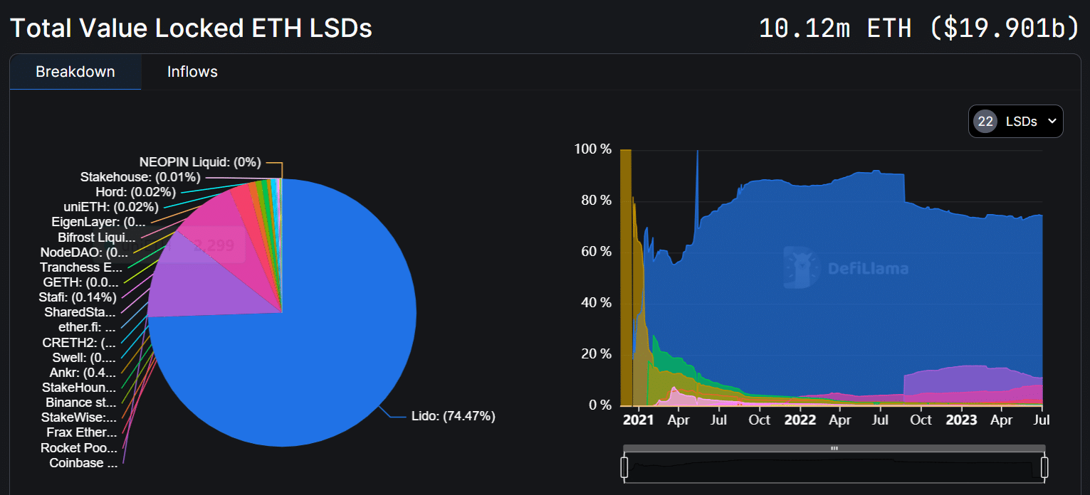 Defilama shows that as of July 3, 2023, more than ten million ethereum (ETH) is locked in liquid staking defi platforms. At the time of reporting, approximately 10.12 m ETH is locked, with a value of $19.901 billion using today’s exchange rates.