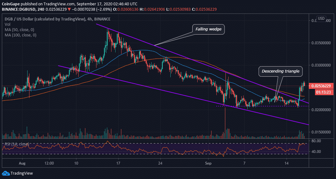 The 4-hour chart shows the formation of a descending wedge following a retreat from August highs at $0.0381. The downtrend was unstoppable until DGB/USD embraced support above $0.02 at the beginning of September. Consolidation swept in, leaving things pretty silent for the past two weeks.
