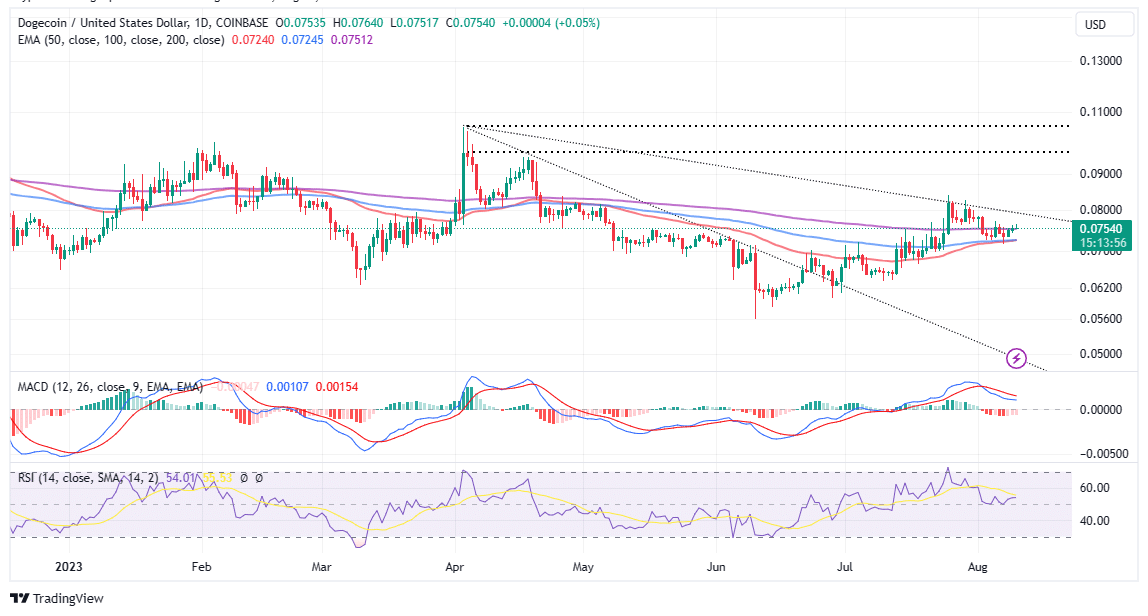 After sustaining a bullish outlook from the previous week’s retracement to $0.072—the confluence support created by the 50-day Exponential Moving Average (EMA) (red) and the 100-day EMA (blue), Dogecoin price holds marginally above the 200-day EMA (purple) at $0.07512.