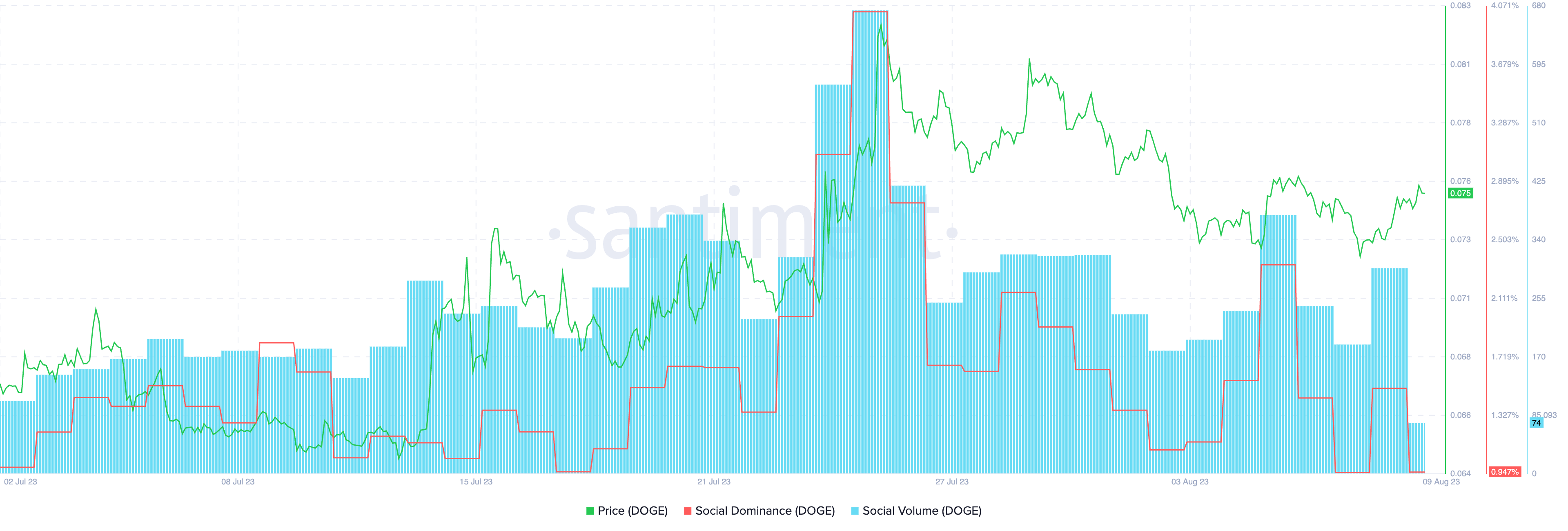 The uptick in Dogecoin’s social volume commenced earlier this week as shown in the chart, implying that the token is falling behind other major cryptos. If this trend continues, Dogecoin price recovery to $0.1 may not be a daunting uphill task.