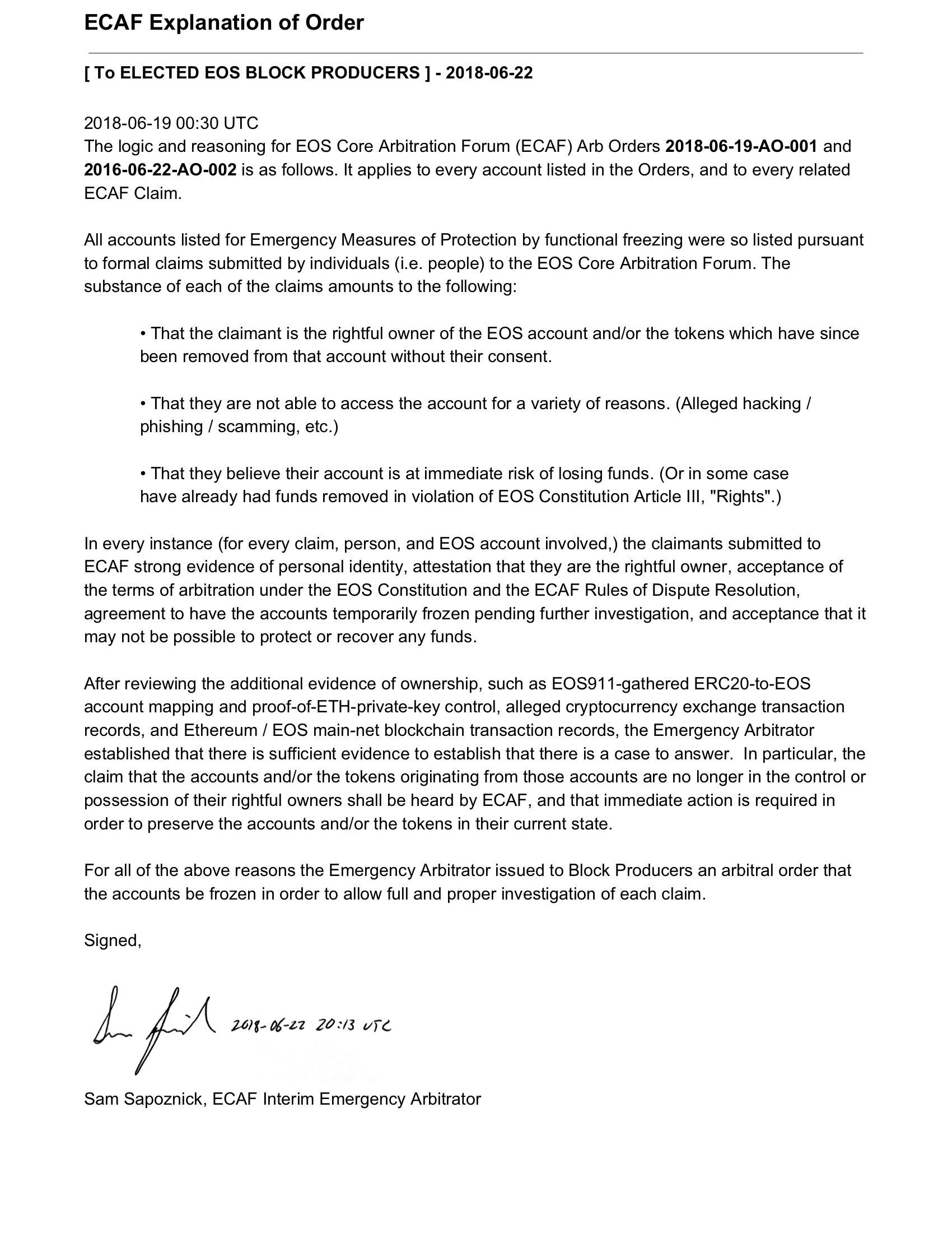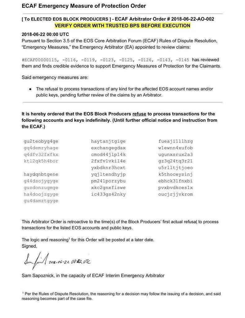 The ECAF Arbitrator Order which is an emergency measure of the protection order to the Block Producers (BP) provides a list of 27 addresses. It gives clear orders to the BPs that they are to refuse to process transactions for the listed addresses and keys for an indefinite amount of period. Or until the ECAF provides any further instructions or notice.