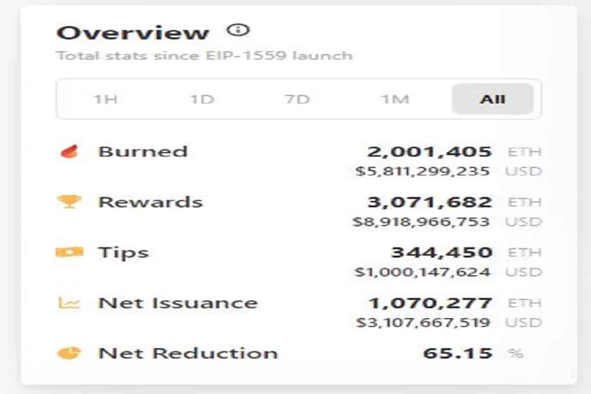 As per Watch the Burn, an ETH burn tracker, EIP-1559 has destroyed 2,001,406 ETH tokens from circulation forever. The data depicts that the net reduction value has been maintained at 65.15%. As per the UltraSoundAwakening, over 6 ETH coin is burnt every minute by the Ethereum. Meanwhile, 133,967 Ethereum coins (worth approx $389 million) have been burnt by the mechanism in the last month.