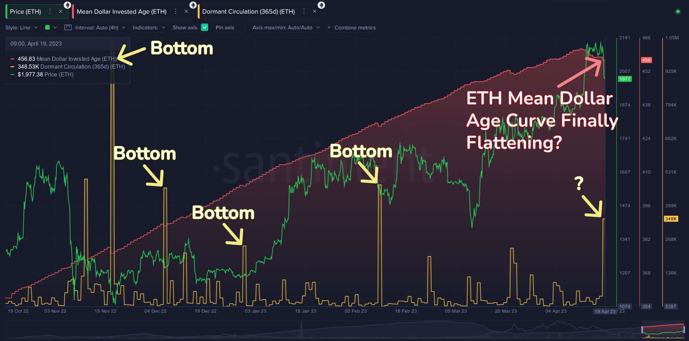 Whenever there’s a spike in the circulation of dormant ETH coins, they have typically coincided with price bottoms.