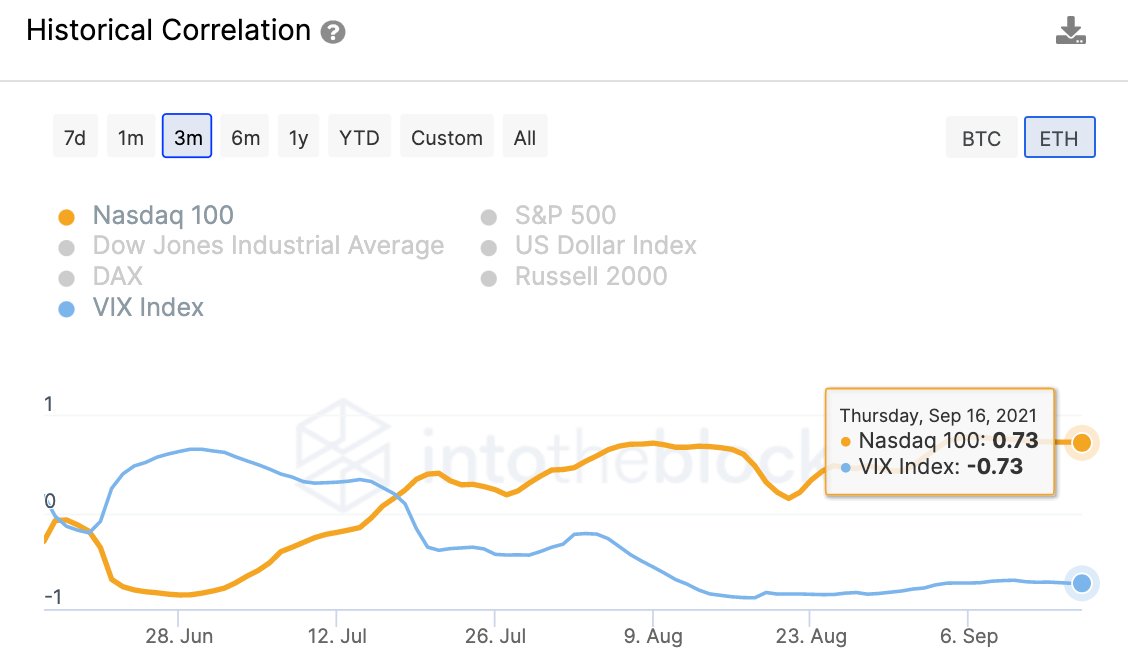 Besides, IntoTheBlock also considers Ethereum (ETH) as a risk-on bet by comparing it to Nasdaq. However, it maintains a negative correlation with the Volatility Index (VIX). The data provider noted:
