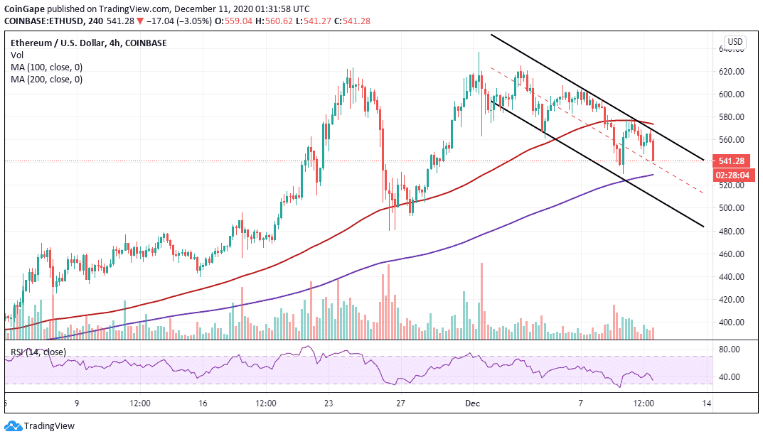 Ethereum is in the middle of a retreat that could soon touch $500 following a failed attempt to recover to $600. The flagship altcoin is teetering at $545 amid fresh declines from the recent rejection at $580. Ether might complete the bearish leg to $500 if a crucial support area is depressed.