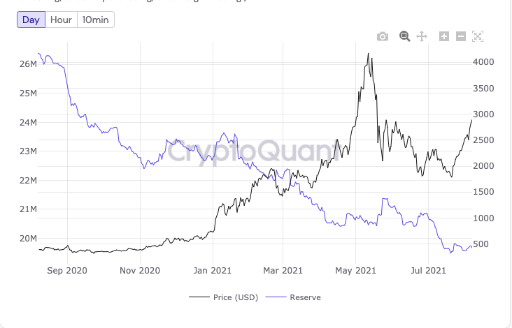 ETH’s price has fallen more than 50% from the top during the May market sell-off, and the altcoin has shown great recovery in the past week after falling to $1,700 levels in May. The current price momentum is being attributed to the supply shock as traders continue to move their ETH holdings away from exchanges. ETH is currently 30% down from its ATH of $4,362.