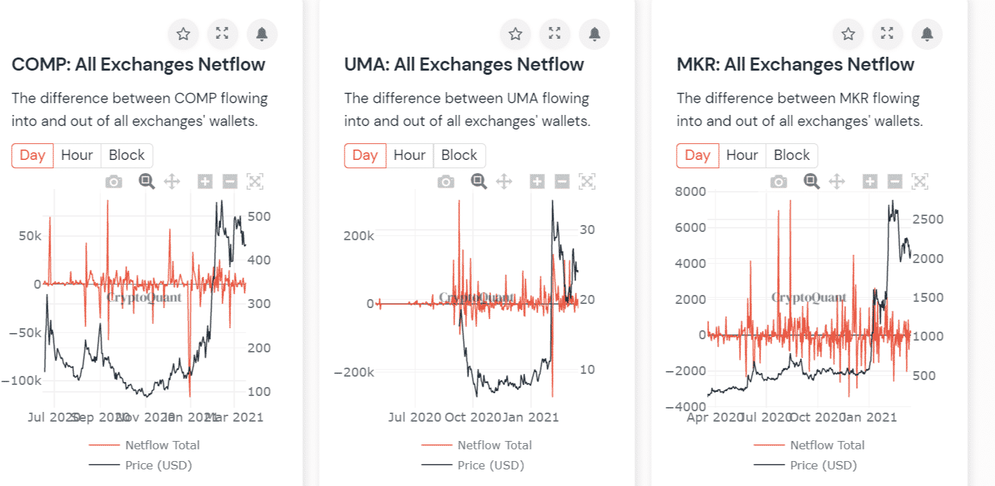 The ratio of exchange volume of these tokens compared to total supply suggest how much the token is being used for various purposes such as staking, institutional buying, and DEX user. A percentage below 5 is considered healthy for a defi token. As per the current volumes $UMA, $MKR, and $COMP look bullish while $BAT with over 15% exchange supply looks bearish.