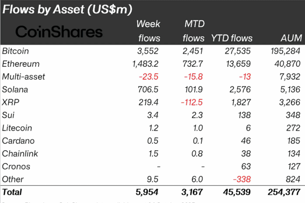 Despite the partial U.S. government shutdown, Solana ETPs are witnessing unprecedented inflows. According to CoinShares, the investment products recorded $706 million in weekly inflows. It pushed total assets under management (AUM) for all Solana ETPs past $5.1 billion. This is more than twice the previous record of $311 million, which was set in July.