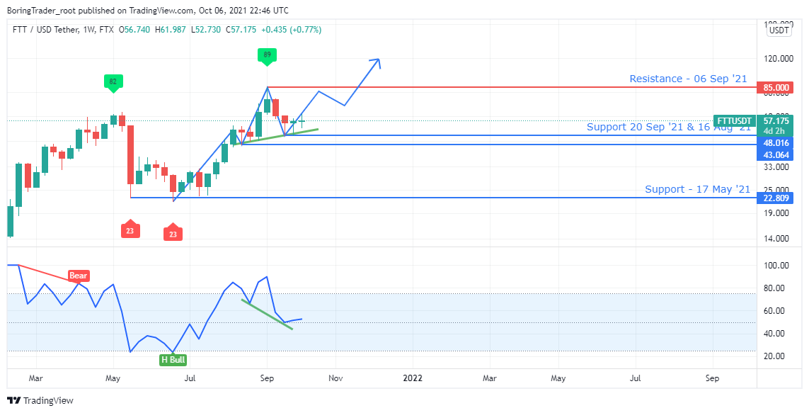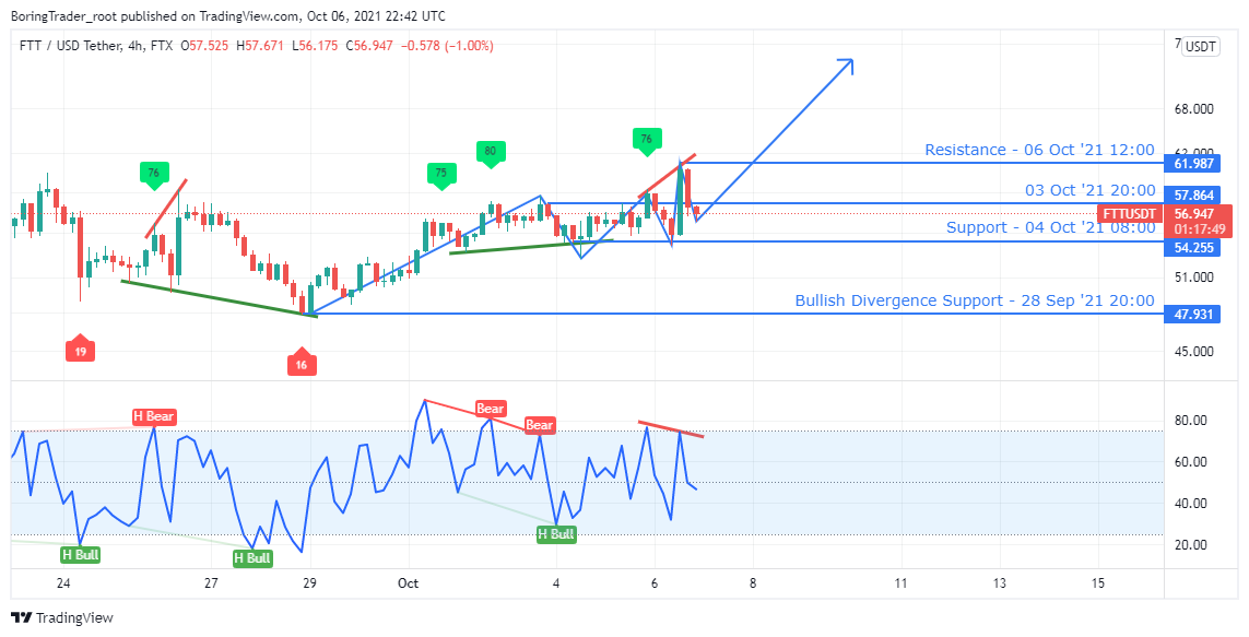 So far, the 4HR time frame also shows growing demand for the FTT token, starting with regular bearish divergence support at $47.931 on 28 Sep ’21 20:00, and followed by another bullish divergence support at $54.255.