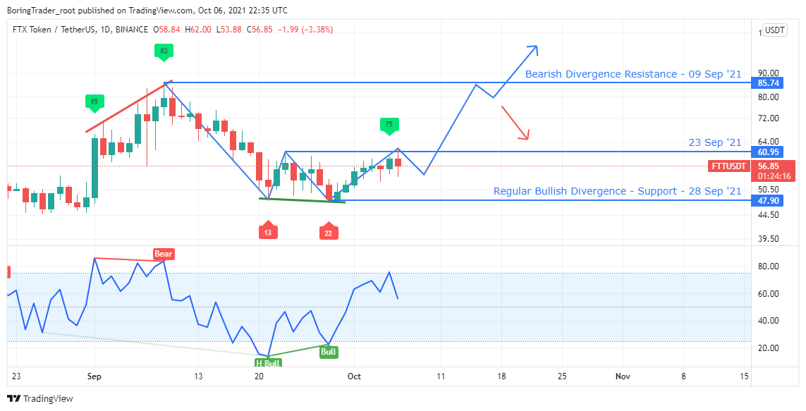 Looking at the FTT token from the daily time frame, the price slump from the 09 September price slump has found support after signaling a regular bullish divergence at $47.90.