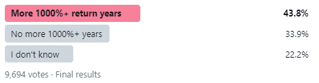 As seen in the poll about 43.8 percent of the respondents were inclined towards more than a 1000 percent return in the coming years. However, 33.9 percent pointed out that a repeat of this kind of return wouldn’t be seen in the near future. 22.2 percent were sitting on the fence unaware of the possible rate of return of the king coin.