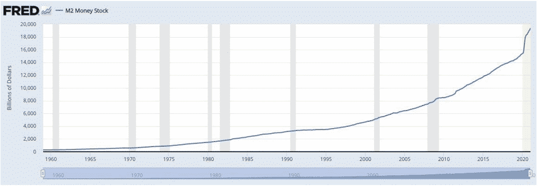 A graph showing the growth of US dollar bills in circulation. During the coronavirus crisis, the US has printed around 35% of all dollars that are currently in circulation. Source: FRED