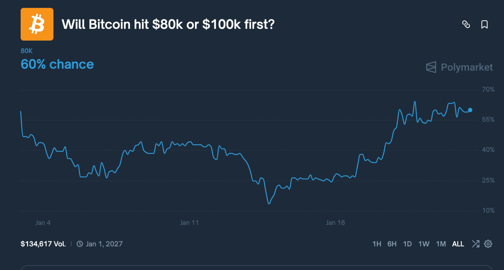 While the founder projected a rally, some traders are pricing in its possible next price. Polymarket data shows that more investors think the coin is going to tank to 80k before making a move up.