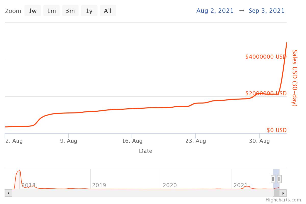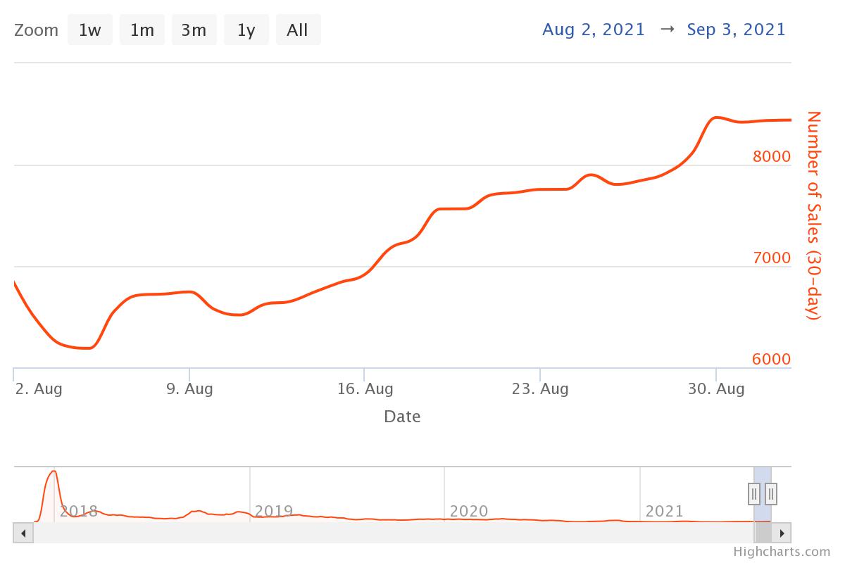 CryptoKitties is on a consistent surge with the total number of monthly sales rising from 6831 on August 2, to 8440 on September 2, 2021, according to NonFungible.com