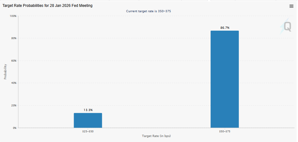 CME FedWatch data show a 13.3% chance of the Fed lowering rates by 25 basis points (bps) in January. Meanwhile, there is an 86.7% chance that the Fed will keep rates unchanged at the January FOMC meeting.