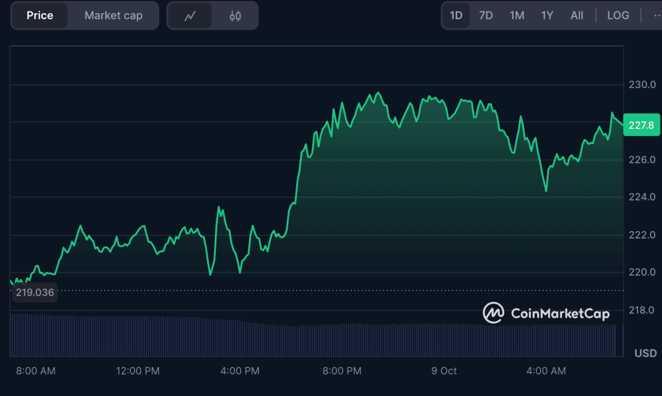 According to CoinMarketCap data, the SOL price rose by 3.56% to $227.40 in the last 24 hours, outperforming the broader crypto market’s 0.69% gain.
