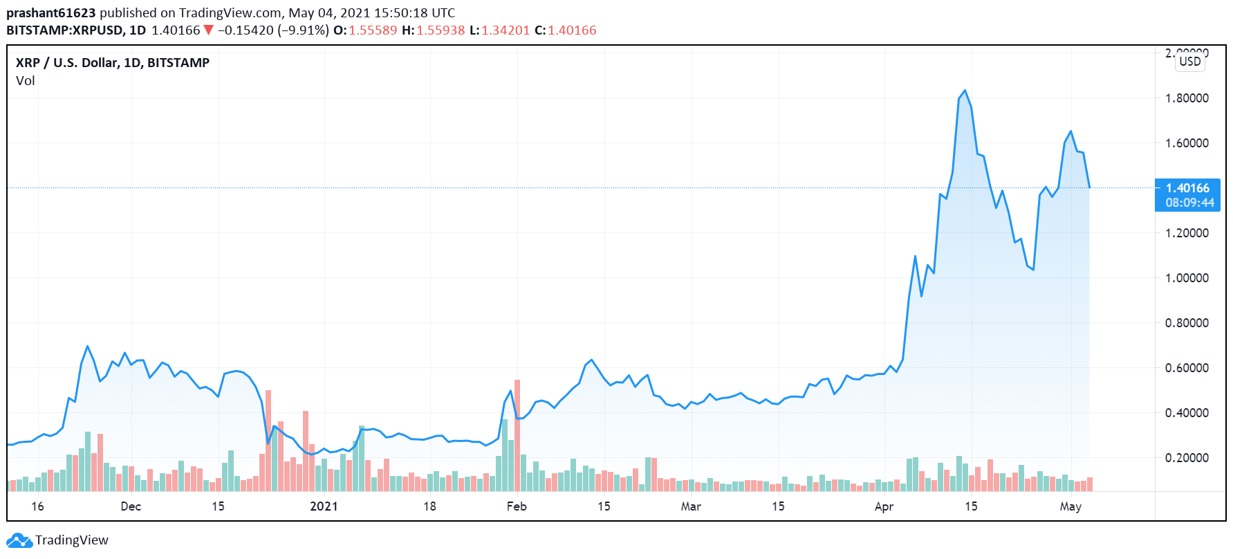 XRP price rose to a new weekly high of $1.66 just late last week after recovering from the two-week low of under $1. However, it has seen the bearish momentum prevail over the bullish once and currently struggling to hold the $1.40 support level.