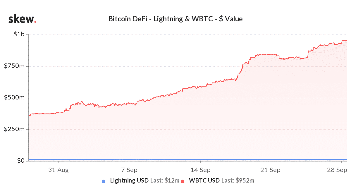 The total value of Bitcoin locked in Ethereum via Wrapped Bitcoin [WBTC] has nearly tripled in a month. According to data provider Skew, the total value of BTC in WBTC was $353 million on 28 August, whereas, the current value stood at $952 million. Whereas Bitcoin on Lightning Network was struggling to surpass $12 million for months.