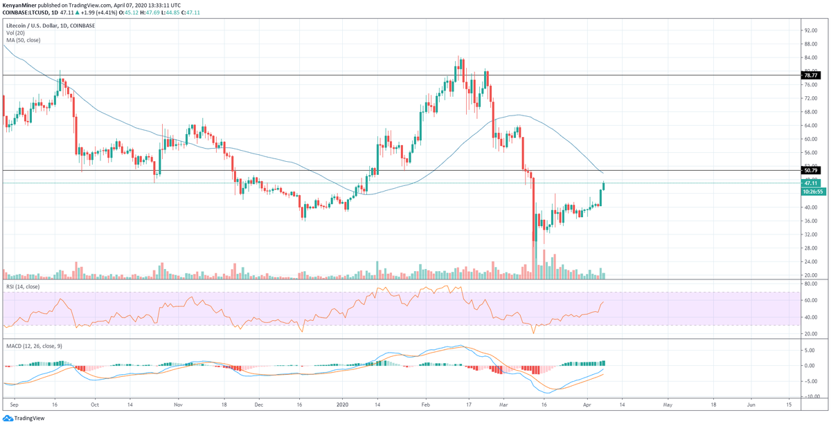 LTC/USD experienced steady growth from an intraday low of $40.01 on Monday this week, to a current price of $47.16, representing a gain of 17.8% in a few hours. However, the current price is a slight dip from an intraday high of $47.82 on Coinbase.