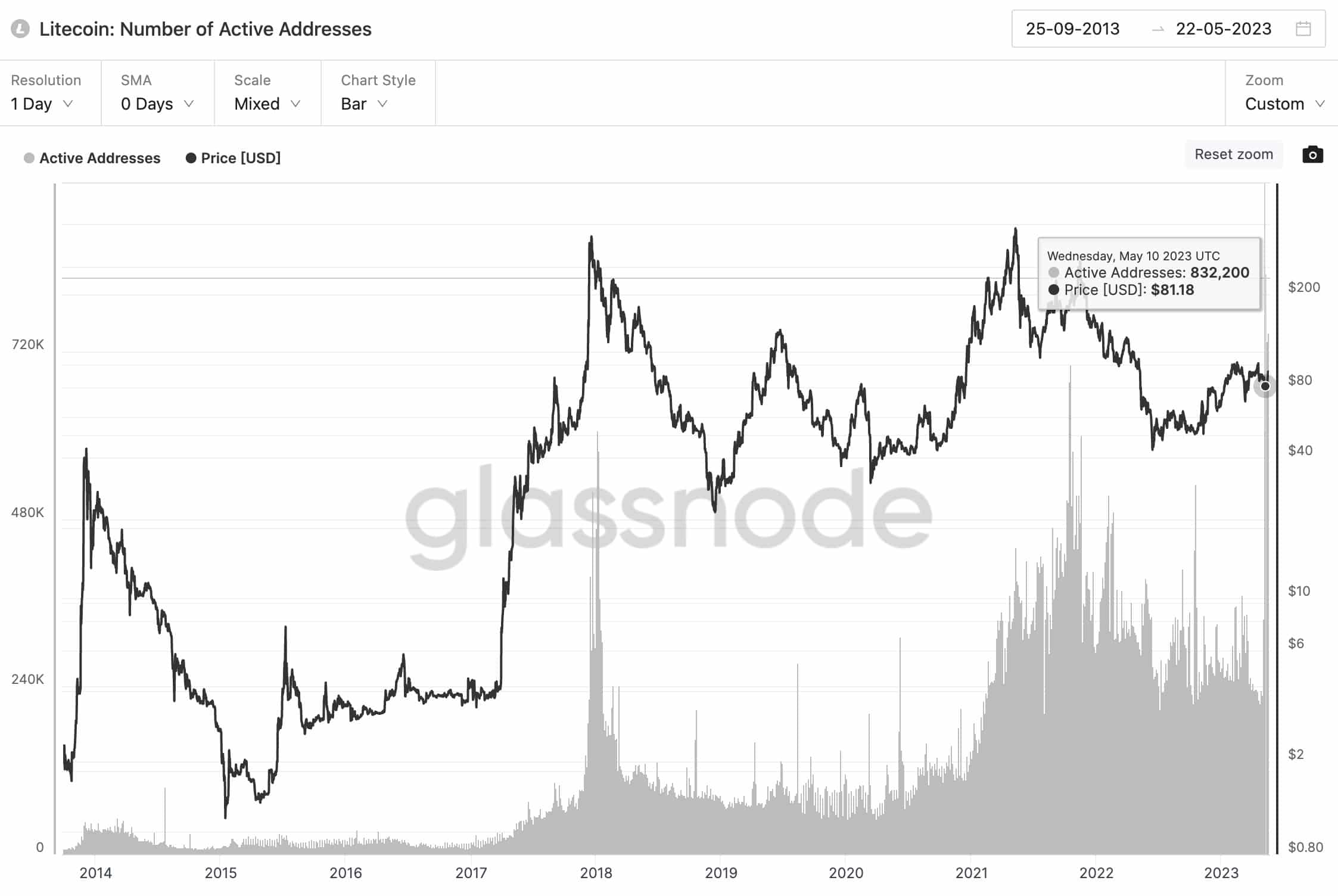“Litecoin recently saw the largest spike in active addresses, where more than 832,000 $LTC addresses were interacting in the network as senders or receivers”.