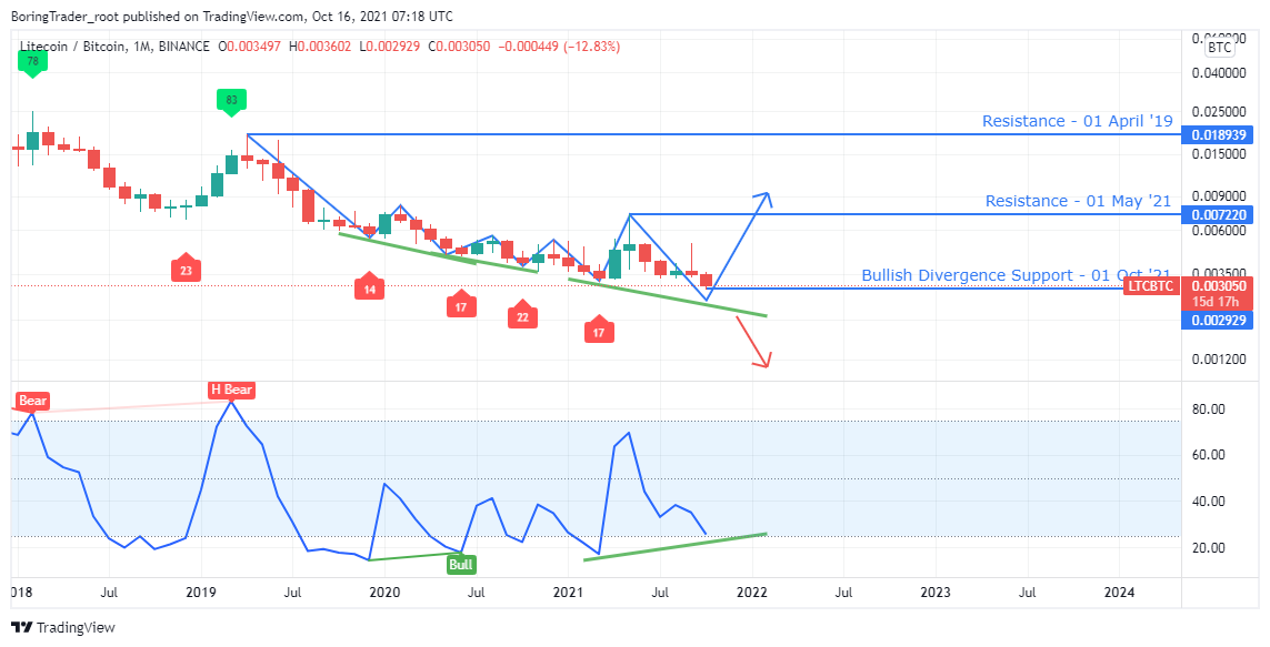 All attempts by LTC bulls against the BTC are to no avail as the price fails to close above a significant resistance, even with a consecutive bullish divergence in June and October ’21. We’ll need to see a price break above 0.007220 for confidence in a general price recovery for the LTCBTC.
