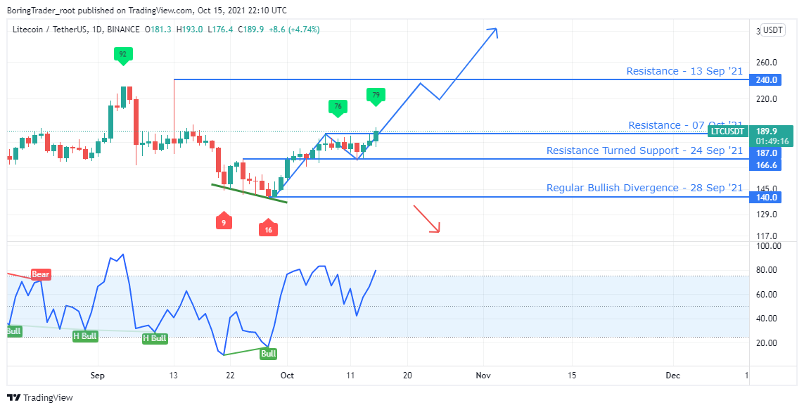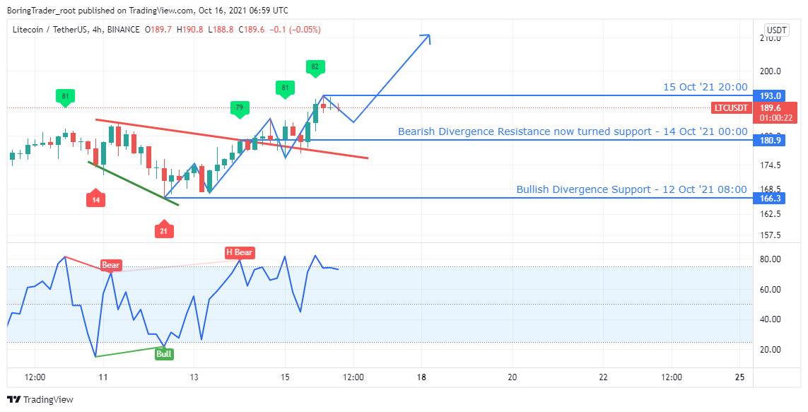The regular bullish divergence support on 12 October ’21 08:00 fixed the LTC support level at $166.30 and advanced further to break the 14 October ’21 00:00 bearish divergence resistance, and flipping it into a new support level.